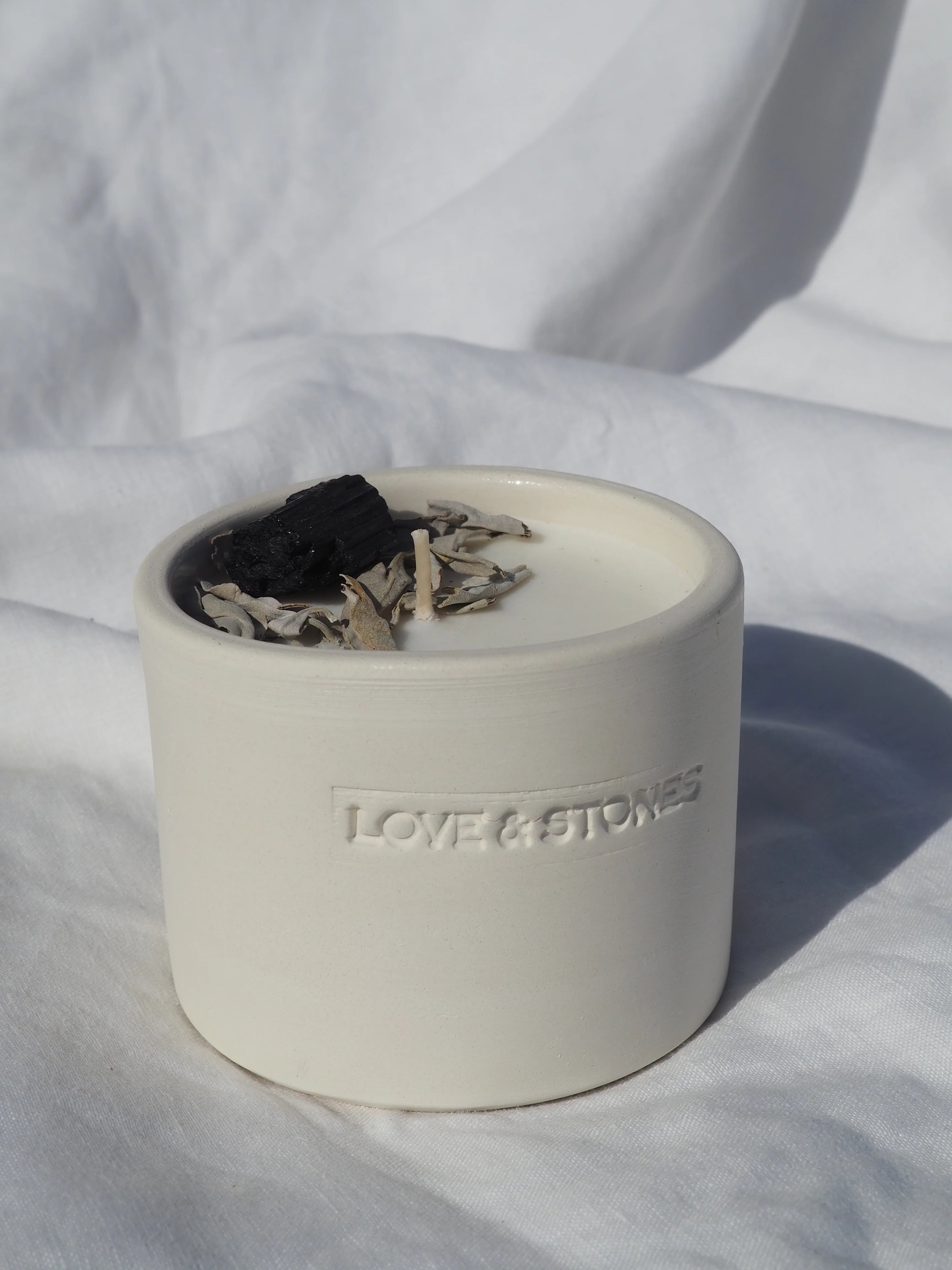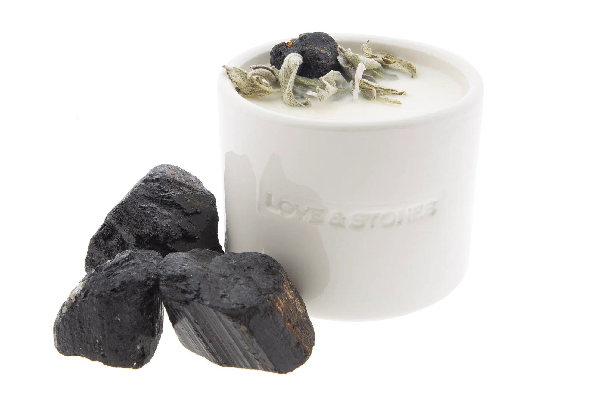 Love & Stones - Let Go - Sage And Black Tourmaline Crystal Infused Scented Tiny White Ceramic Candle