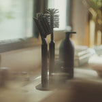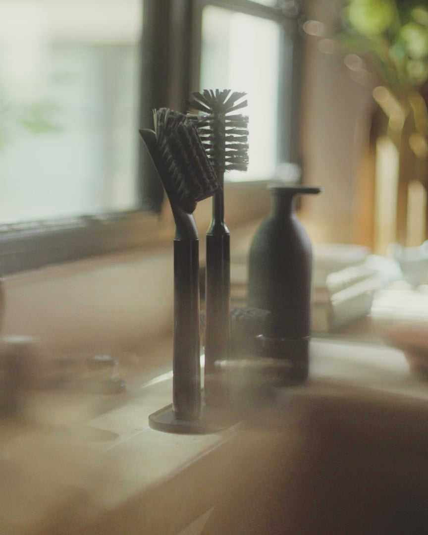 Durable, streamlined, stainless steel handles are magnetized to stand upright and last a lifetime. Your complete dishwashing brush set. Talk about kitchen essentials.