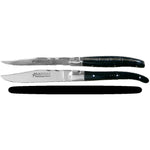 The highest quality Laguiole steak knife you can get : 23 cm not folding blade, 90 grams, made from one single forged piece of Z40C13 stainless steel. Lifetime guarantee (normal use only) Handle : Real black buffalo horn tip (we do not use the cheap hollow "genuine" horn) with the traditional shepherd's cross inlayed. The handle is thick and comfortable when you 're eating. This classy model (black horn & shiny metal) can go with all kind of silverware and classical tables. harpness : The blade is sharpenned for a long time. You can choose - see options - to add free of charge a 'Diamond' micro-serration on one side of the blade : it is alsmost invisible and will extend sharpness. Warranty : Our Laguiole cutlery carries a lifetime guarantee. This is for normal use only. It is NOT dishwasher safe. Vernished wooden box ( Made in France ) included