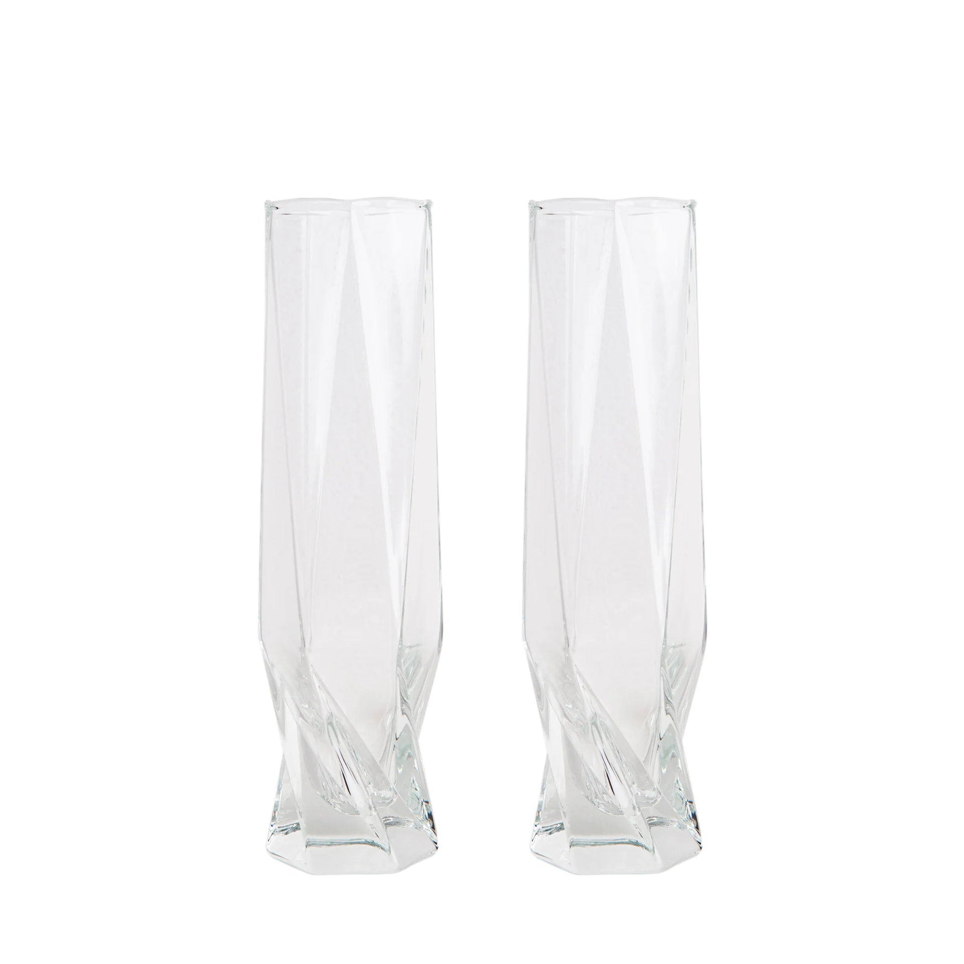 A pair of handcrafted Champagne Flute glasses with a solid base and a faceted design for comfortable holding. Inspired by precious stones and designed for those occasions that call for a celebration or just any excuse to sip some bubbles.