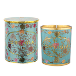 A decorated glass candle jar of pale blue wax, rich with the natural essence of Sicilian spring flowers.